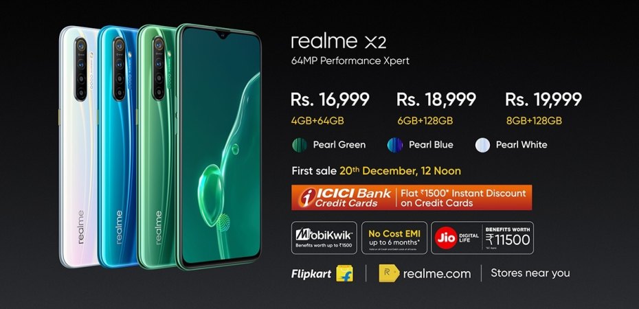 Launch offers on the Realme X2 include a flat Rs. 1,500 discount on ICICI Bank credit card, MobiKwik benefits up to Rs. 1,500, no-cost EMIs up to 6 months, and Jio benefits up to Rs. 11,500.