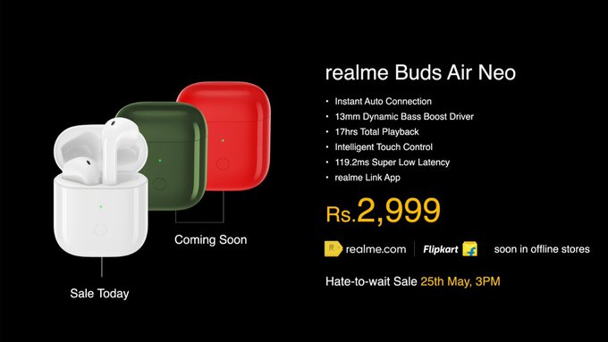 Realme Buds Air Neo is available in three colours– white, green and red and is priced at Rs 2,999. The white colour variant is up for grabs starting May 25 while the other two colours will go on sale at a later date. It’s available to purchase from Realme India store, Flipkart and will soon make it to the offline market as well.