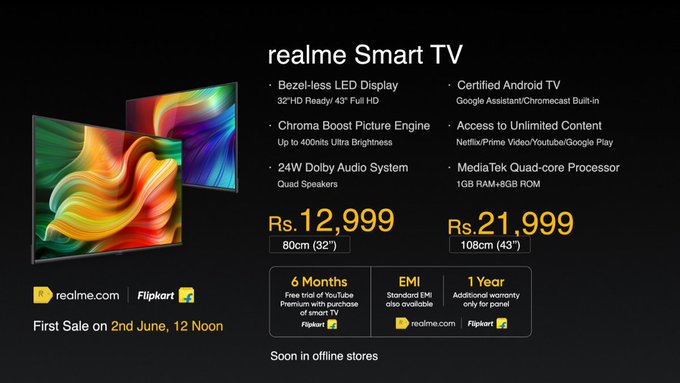 Realme TV 32-inch is priced at Rs 12,999 while the Realme TV 43-inch will be up for grabs at Rs 21,999. The first sale is scheduled for June 2 on Flipkart and Realme India store.