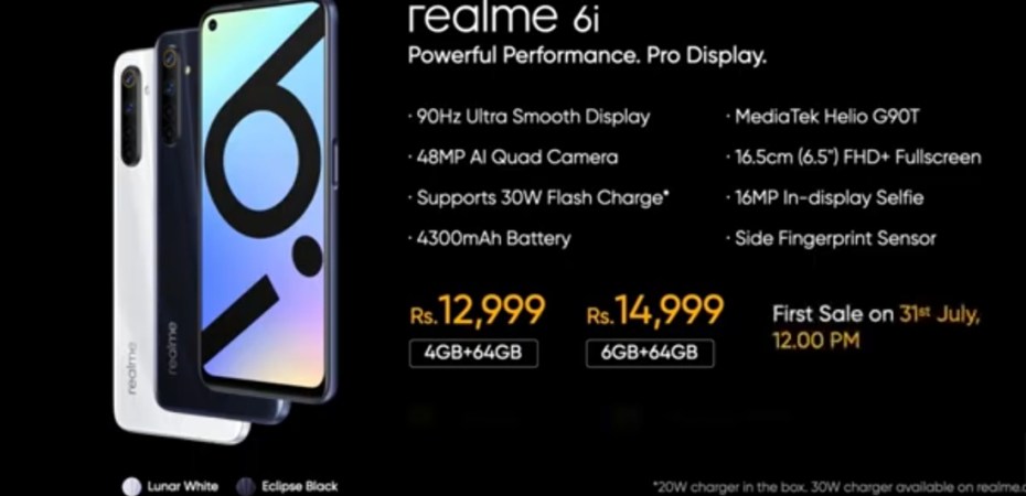 The realme 6i comes is priced at Rs. 12,999 for the 4GB RAM with 64GB storage version and the 6GB RAM with 64GB storage version costs Rs. 14,999. It will be available from Flipkart and realme.com starting from July 31st.